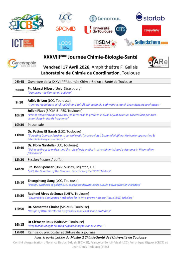 La prochaine édition de la Journée scientifique toulousaine de Chimie-Biologie-Santé (JCBS) aura lieu le vendredi 17 avril 2026 à l'auditorium Fernand Gallais du laboratoire de chimie de coordination.