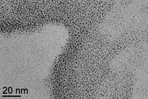 La substitution de certains ligands CH3CN et/ou CO par le groupement thiophène du ligand terpyridine du complexe RuNO a été mise en évidence par spectroscopie infrarouge. Les nanoparticules de platine ainsi fonctionnalisées, de formule postulée Ptx’(CO)y’(CH3CN)z’(RuNO)t, se regroupent en agrégats dans lesquels la taille des particules individuelles est de 1 à 3 nm (Figure 5).