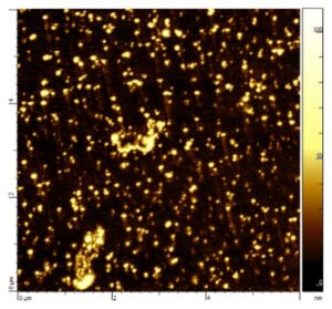 Figure 1 : Image AFM de nano-agrégats du complexe trans(Cl,Cl)-[RuFTCl2NO]PF6 dispersés dans l’eau (diamètre moyen : 16 nm)