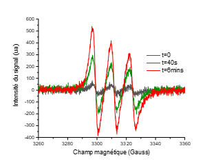 Figure 3 : Mise en évidence par RPE de la libération de NO pour un hydrogel hydrogel PL/CS incorporant le complexe trans(Cl,Cl)-[RuFTCl2NO]Cl (13 µg.g‒1)