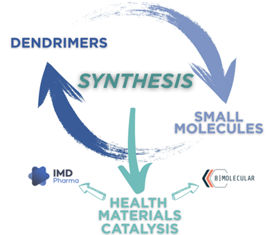 L’équipe « Dendrimères et petites molécules thérapeutiques » s’intéresse aux trois grands domaines de recherche du LCC que sont la chimie pour la santé, la catalyse et les matériaux, à travers le développement de deux grands axes de recherche interconnectés.
