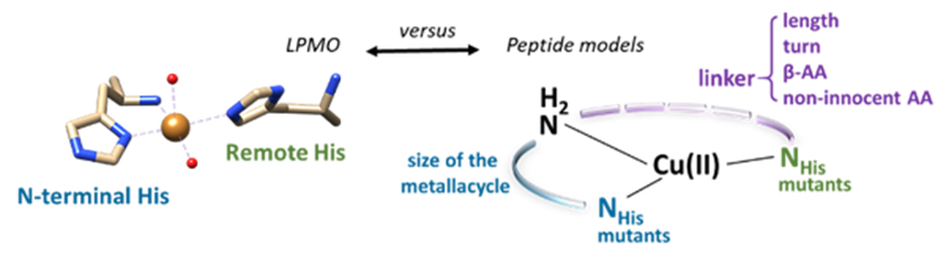 We aim at designing and characterizing bio-inspired catalytically active peptide models of the Lytic Polysaccharide Monooxygenases, which are copper-containing enzymes responsible for the hydroxylation of inert C-H bonds of polysaccharides. Beyond the delivery of catalytic complexes, we will provide structure-activity relationships (SAR) and thus key factors to rationally guide the further development of environmentally benign and cost-effective bio-inspired catalysts.
