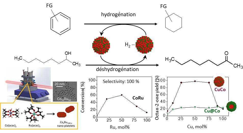 Among the soft chemistry routes for nanoalloy synthesis, the polyol process has proven especially attractive as the solvent simultaneously acts as a reducing and complexing agent and the synthesis temperature (180-300°C) is sufficiently high to promote good cristallinity. However, the morphology and structure of the resulting NPs are strongly influenced by numerous paramaters. An understanding of the mechanism of the reduction and formation mechanisms is therefore essential to rationalize synthesis strategies, particularly for bimetallic NPs. Spectroscopy techniques such as UV-visible and in situ X-ray absorption, complemented by other characterization methods, provide valuable insights into these mechanisms. This will be illustrated through the case study of CoRu nanoalloys. Furthermore, the improvements of the catalytic properties provided by alloying Co with other metals, Ru but also Cu, on the dehydrogenation of alcohols will be discussed as well as the issue of catalyst recyclability.