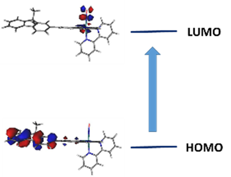 Le rendement quantique (ΦNO) est une propriété de l’état excité et dépend donc de son évolution. L’absorption initiale d’un photon conduit dans tous les cas à augmenter sensiblement la densité électronique sur le ligand nitrosyle. C’est ce dont témoigne la figure ci-dessous qui illustre la transition HOMO ® LUMO dans le cas du composé 1.